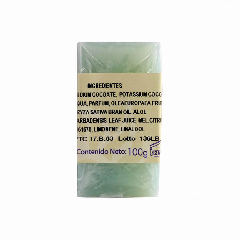 Elaborado en frío con aceites vegetales (oliva, coco y arroz) ricos en ácidos grasos esenciales, miel y esencias de plantas.